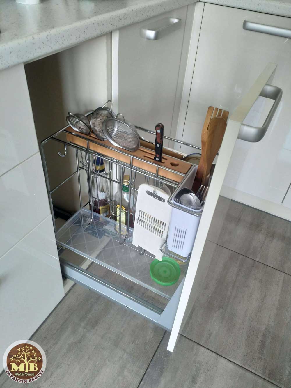 Практично для всіх кухонних предметів створені системи зберігання. Розміщення всіх додаткових механізмів ви можете обговорити з нашим дизайнером при замовленні кухні, адже щоб правильно їх вибрати та розмістити потрібно врахувати не лише ваше бажання але й розмір кухонного гарнітуру, та технічних даних цих систем. Всі такі системи можуть бути вмонтовані та мобільні, а також зовнішні та внутрішні – які з них вибрати вирішувати вам. При виборі врахуйте не лише зовнішній вигляд але й ергономічність і зручність прибирання. Ті що розміщені ззовні будуть припадати пилом а інколи і жиром (адже це кухня) а це однозначно ускладнить процес їх прибирання. Розглянемо основні із них: