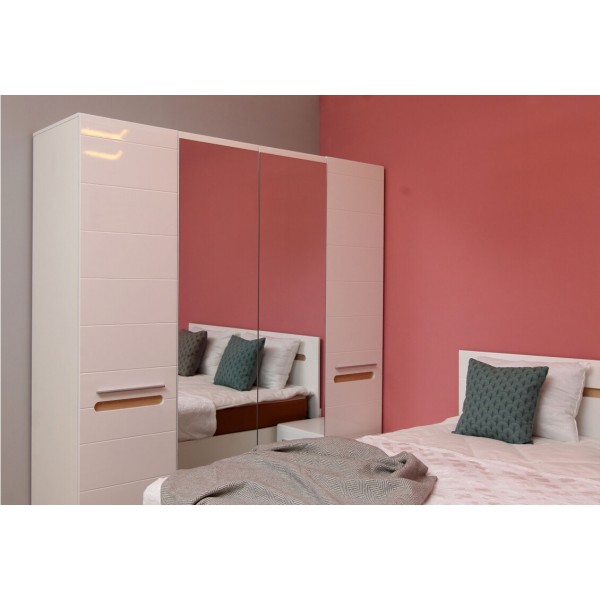 Фасады спальни выполнены из глянцевой МДФ, что придает ей элегантный и модный вид. Благодаря глянцевому покрытию, они легко моются и не подвержены царапинам.