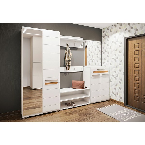 - Фасад из глянцевой МДФ придает прихожей элегантный внешний вид и легко сочетается с другими элементами интерьера.