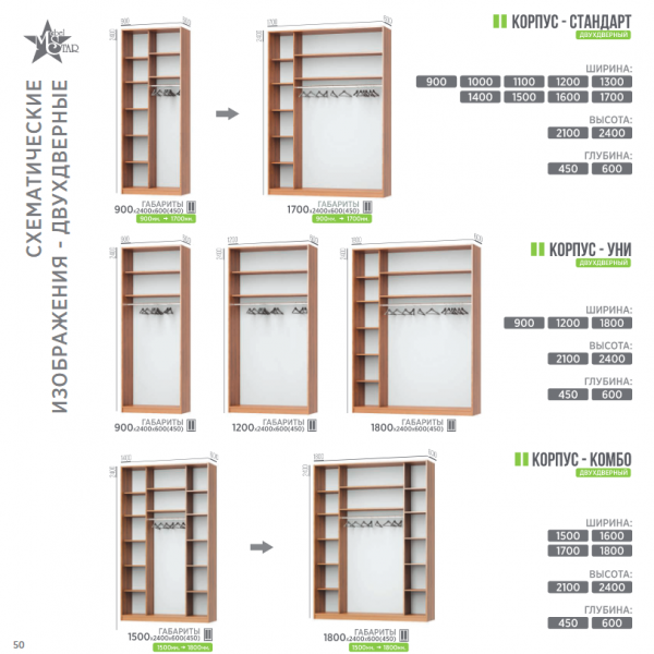 При ширине шкафа-купе от 1,0 м до 1,9 м отделение с полками ширина 450 мм, от 2,0 м до 2,7 м отделение с полками ширина 600 мм.